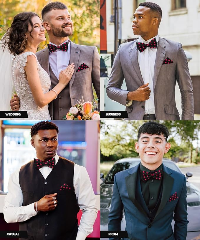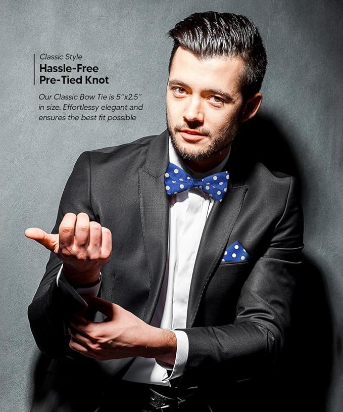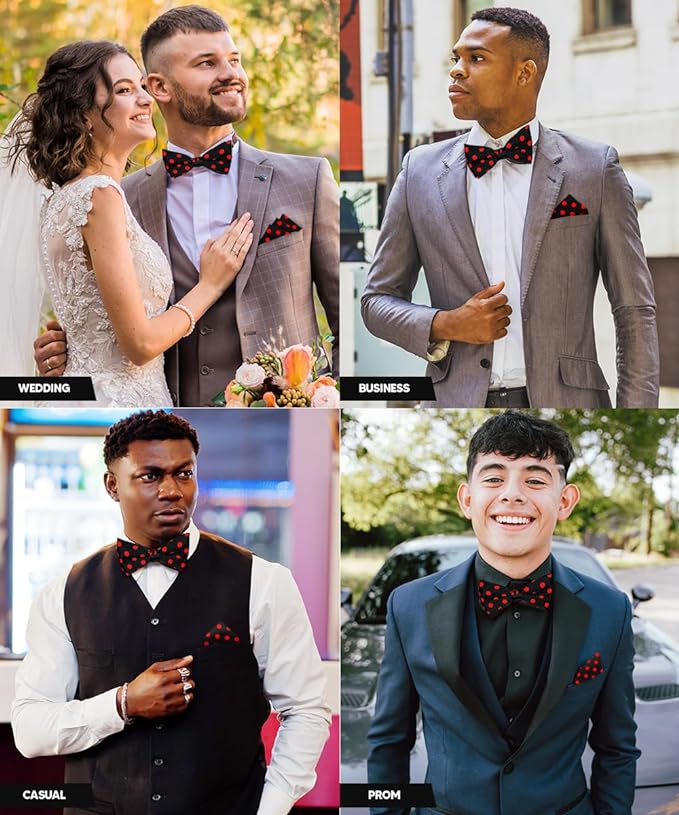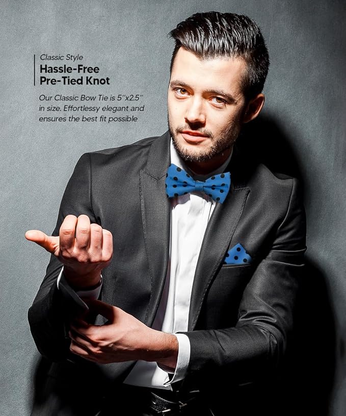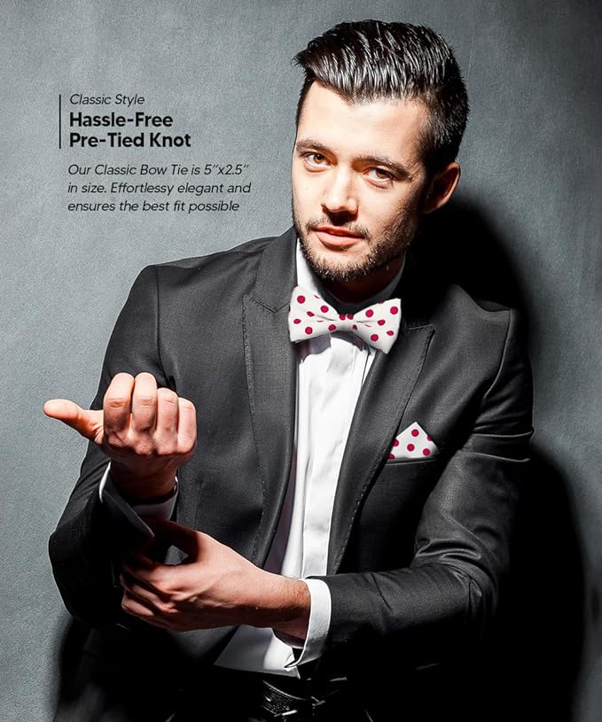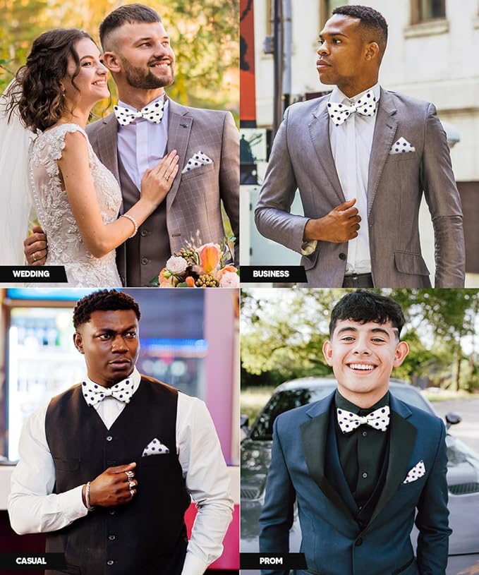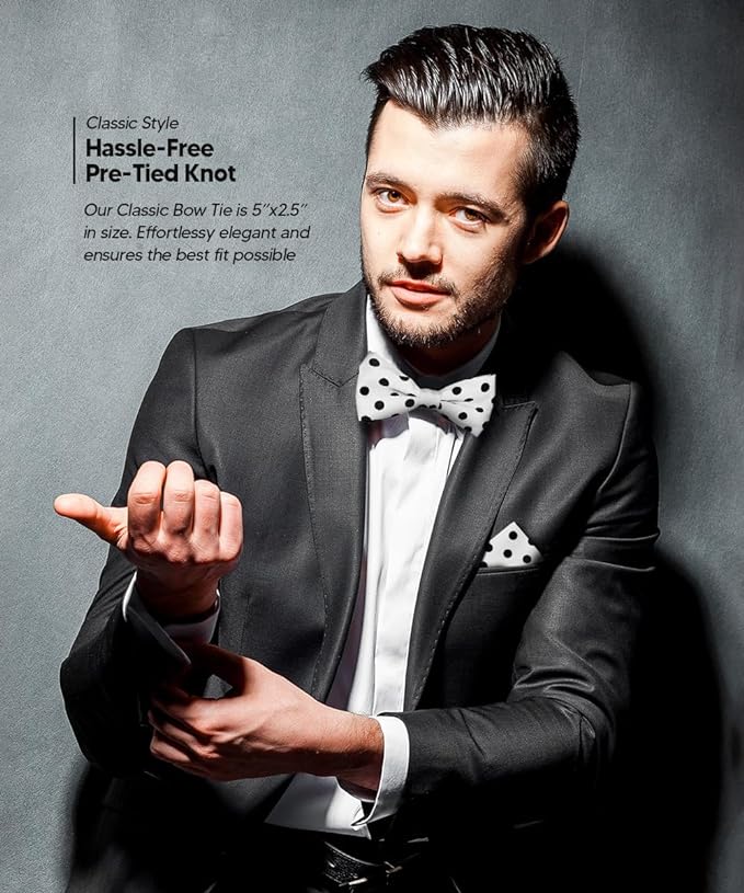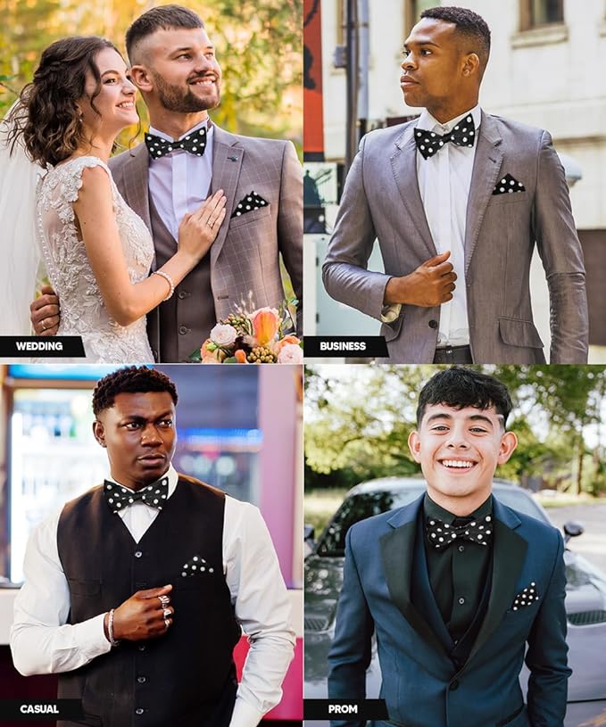 - STYLISH: Sometimes the smallest details can make the biggest difference. Men’s Pre-tied Polka Dot Bow Tie & Pocket Square is the perfect accessory for your shirt, blazer, suit or tuxedo. The stylish Pocket Squares for men add a stylish touch.