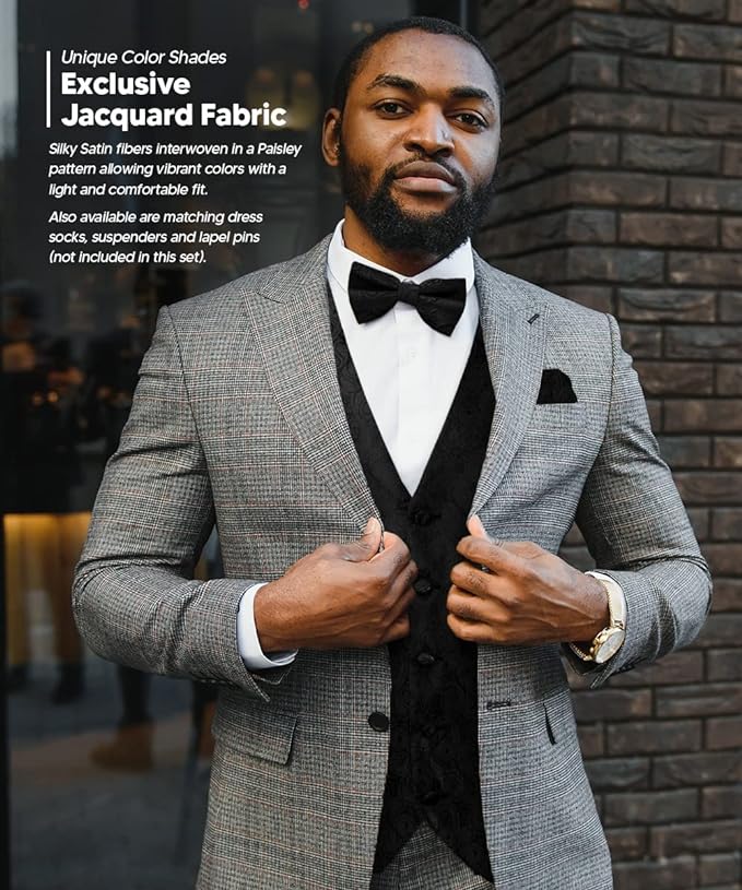Vittorio Farina Men's Woven Paisley Vest, Necktie, Bow Tie and Pocket Square Set (Black Back)