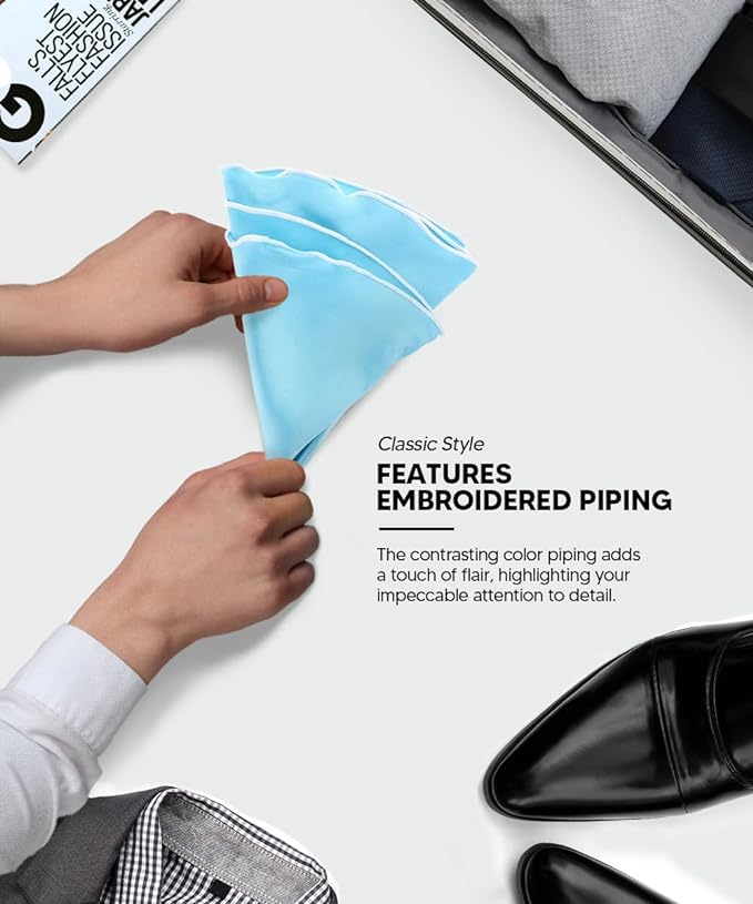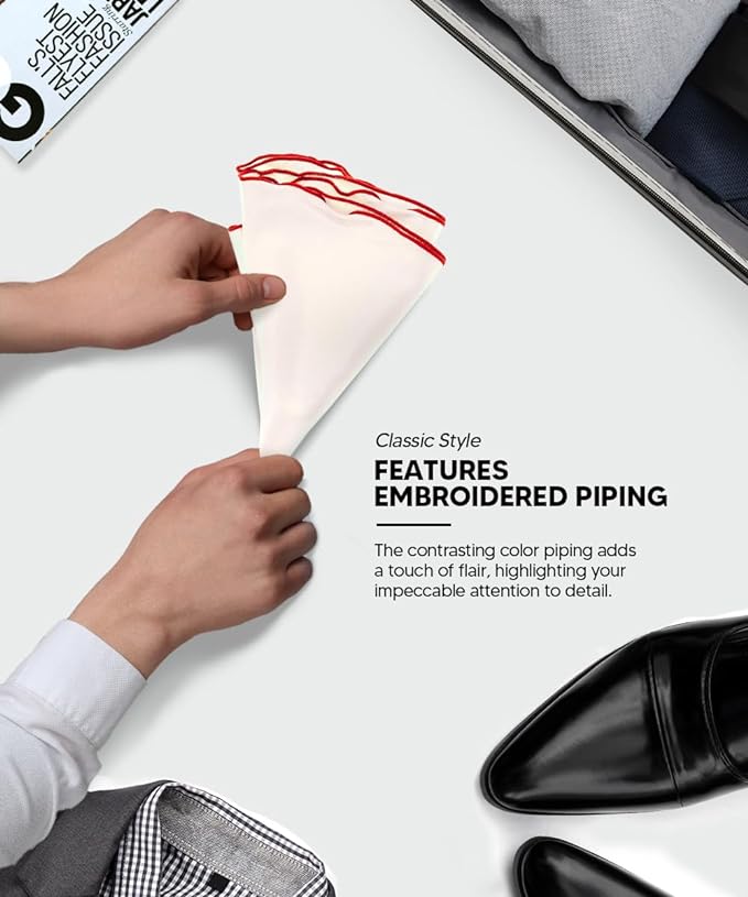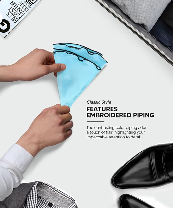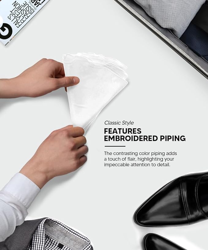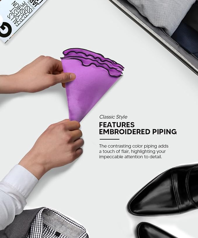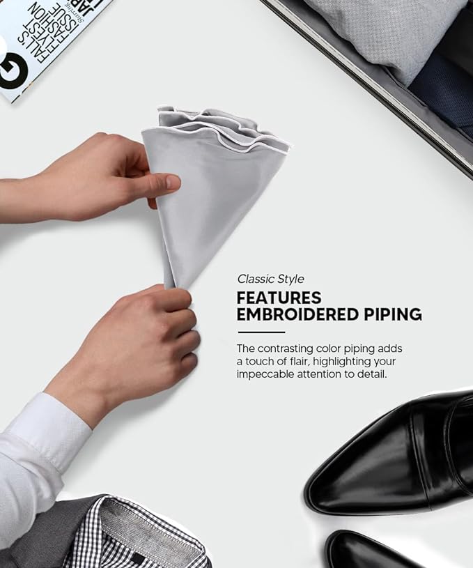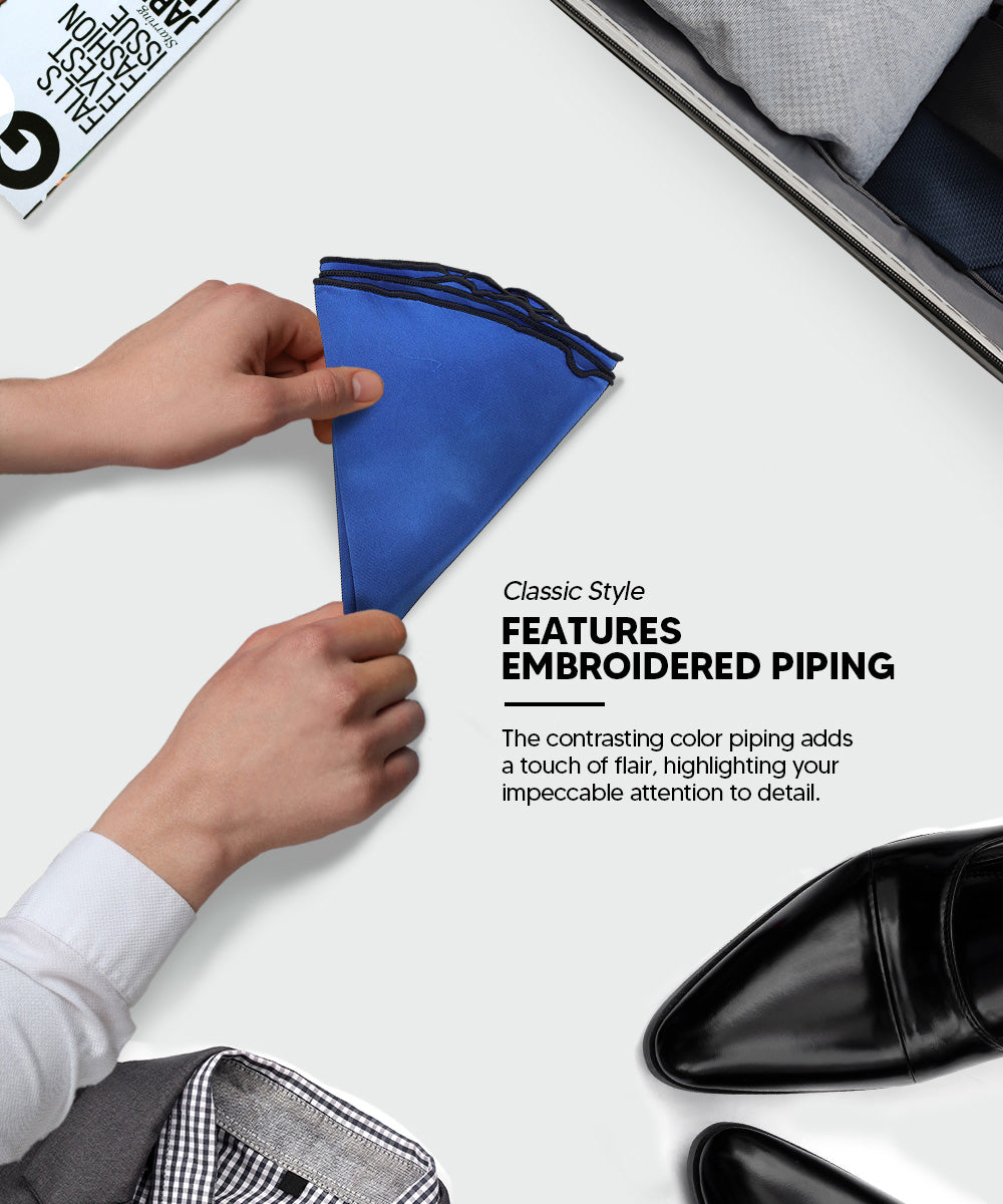 - STYLISH: Sometimes the smallest details can make the biggest difference. Men’s Round Pocket Square with Embroidered Piping is the perfect accessory for your shirt, blazer, suit or tuxedo. The stylish Pocket Squares for men add a stylish touch.
