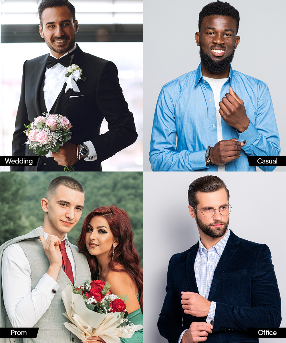 - OCCASION / LIFESTYLE: Make a style statement for all formal or informal special occasions: wedding party, groomsmen, graduation, prom, quinquennia’s, family pictures, office, school performances or zoom call. Dress it up with your favorite dress shirt. All seasons.
